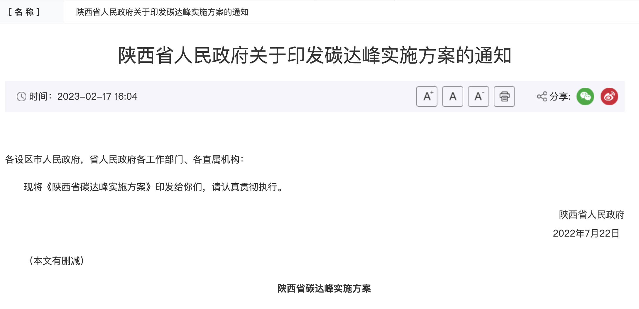 氫啟未來網獲悉,2月17日,陜西省人民政府發布關于印發碳達峰實施方案的通知