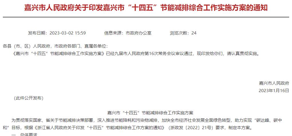 氫啟未來網獲悉,3月2日,嘉興市人民政府發布關于印發嘉興市“十四五”節能減排綜合工作實施方案的通知。