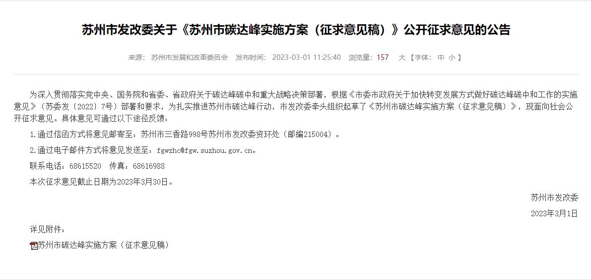氫啟未來網獲悉,3月1日,蘇州市發展和改革委員會印發《蘇州市碳達峰實施方案(征求意見稿)》