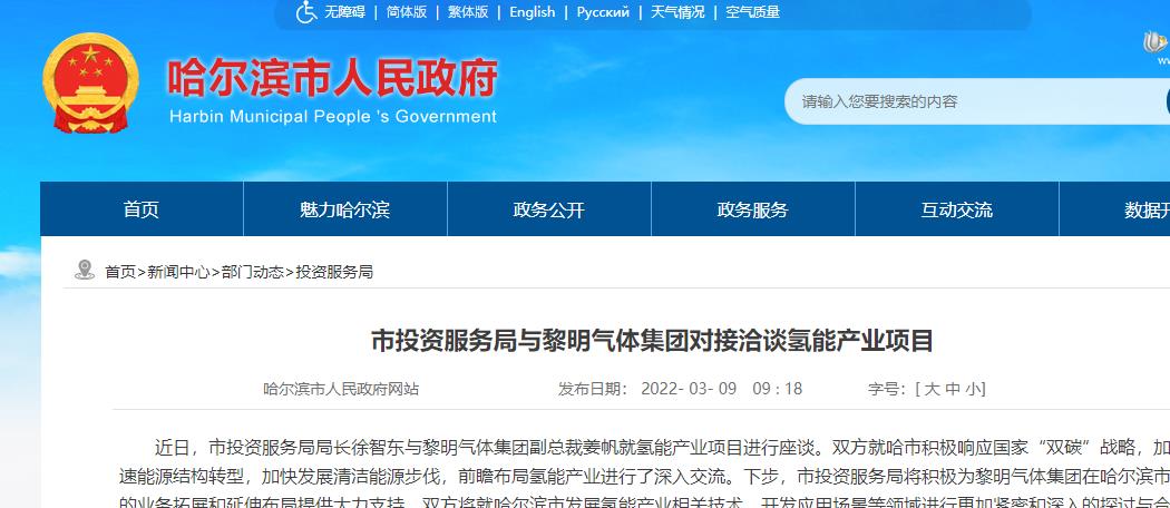 哈爾濱市投資服務局與黎明氣體集團對接洽談氫能產業項目