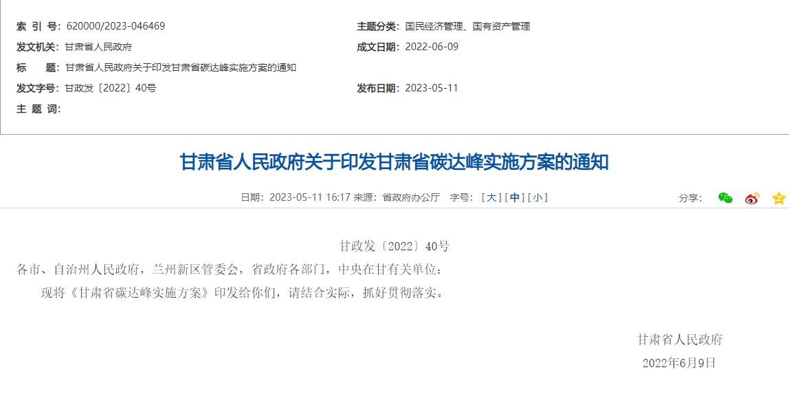 氫啟未來網獲悉,5月11日,甘肅省人民政府發布關于印發《甘肅省碳達峰實施方案》的通知