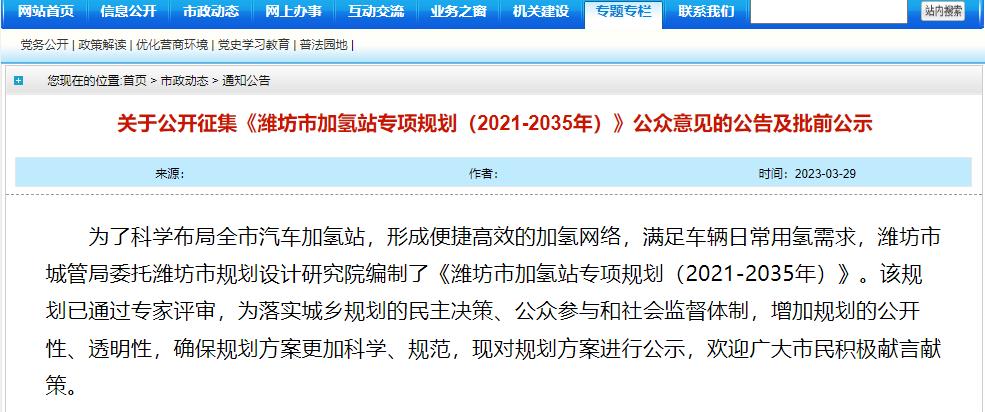 氫啟未來(lái)網(wǎng)獲悉,近日,為了科學(xué)布局濰坊市汽車加氫站,形成便捷高效的加氫網(wǎng)絡(luò),滿足車輛日常用氫需求,濰坊市城管局委托濰坊市規(guī)劃設(shè)計(jì)研究院編制了《濰坊市加氫站專項(xiàng)規(guī)劃(2021-2035年)》。