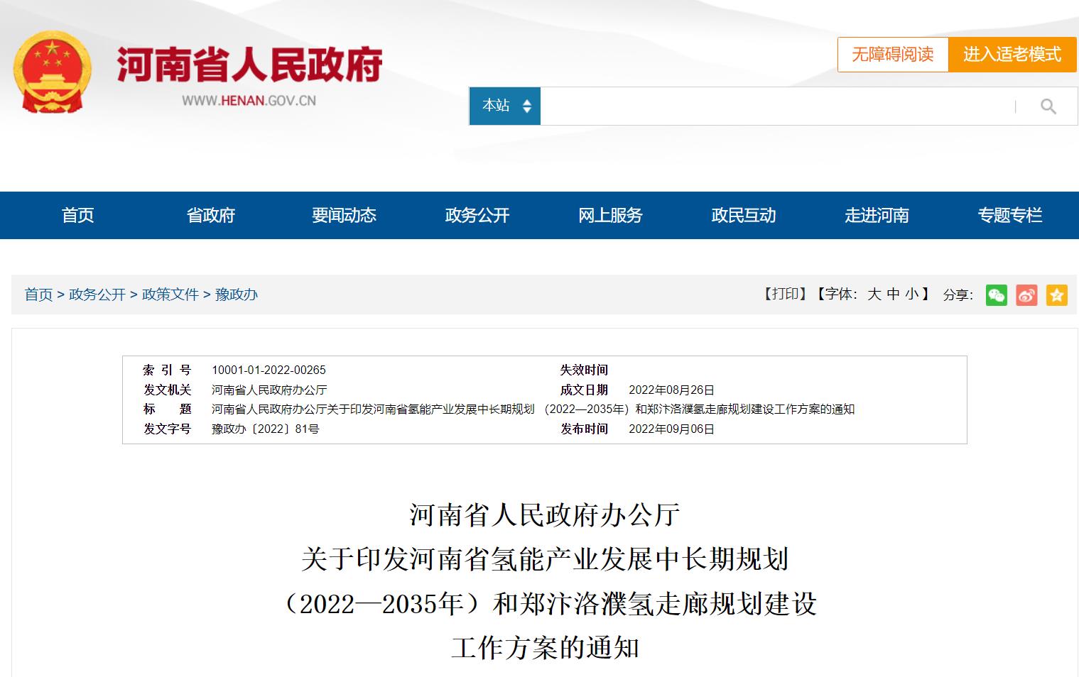 9月6日,河南省人民政府辦公廳發(fā)布關(guān)于印發(fā)河南省氫能產(chǎn)業(yè)發(fā)展中長(zhǎng)期規(guī)劃(2022-2035年)和鄭汴洛濮氫走廊規(guī)劃建設(shè)工作方案的通知,其中河南省氫能產(chǎn)業(yè)發(fā)展中長(zhǎng)期規(guī)劃(2022—2035年)原文如下