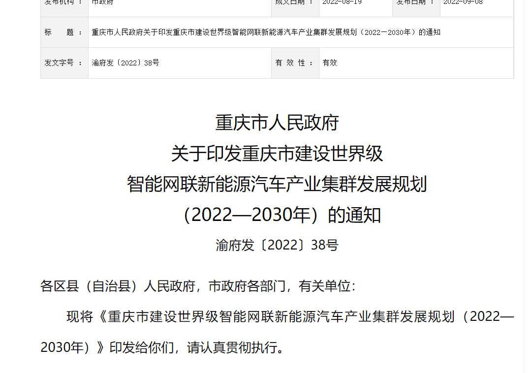9月8日,重慶市政府發(fā)布關(guān)于印發(fā)《重慶市建設(shè)世界級(jí)智能網(wǎng)聯(lián)新能源汽車產(chǎn)業(yè)集群發(fā)展規(guī)劃(2022—2030年)》的通知(以下簡(jiǎn)稱《規(guī)劃》)。