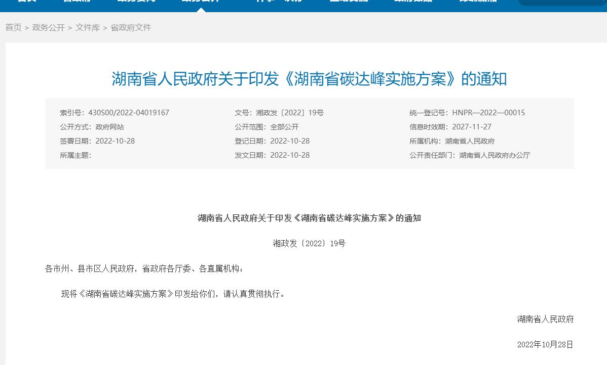 氫啟未來網(wǎng)獲悉,10月28日,湖南人人民政府發(fā)布關(guān)于印發(fā)《湖南省碳達(dá)峰實施方案》的通知