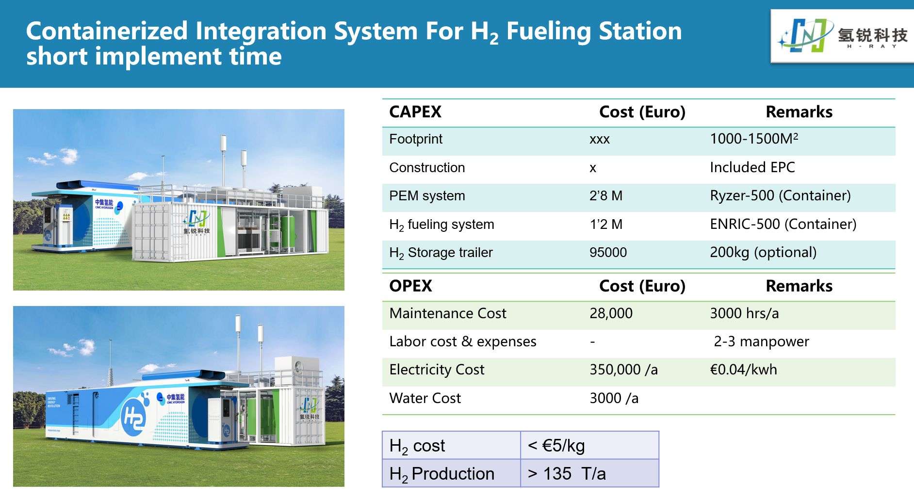 歐洲法規(guī)并沒有限制制氫需要在化工園區(qū),而是需要環(huán)境和能源部門審批,在加油站擴建制氫加氫站,利用交易電價(PPA)制氫,將大大降低氫的成本,采用一臺Ryzer500撬裝一體化制氫設(shè)備,配合撬裝儲氫和壓縮系統(tǒng),占地約1500平米,每天制氫超過500kg,年制氫135噸。制氫成本為5歐元/kg,將更加有利的推動氫能交通的發(fā)展。