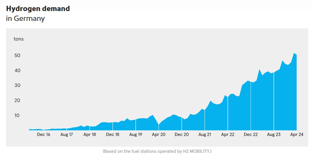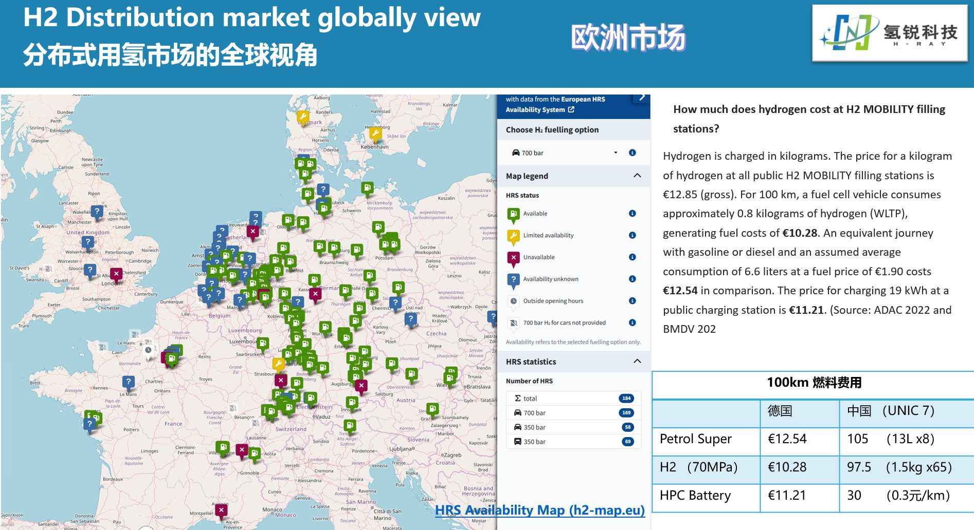 燃料成本決定出行方式,以100公里為例,采用95號汽油,其費用為12.54歐元,采用氫氣費用為10.28歐元,采用電車充電費用為11.21歐元,歐洲電價貴和充電樁少,充電需要辦會員卡,這都是推動了氫燃料電池交通的快速發(fā)展的因素。從H2MOBILITY 統(tǒng)計的數(shù)據(jù)來看,2018后,也就是俄烏沖突后,由于天然氣成本的上升導(dǎo)致電價的上升。 但是,采用可再生能源制氫的氫價相對比較穩(wěn)定,推動了氫能交通的發(fā)展。