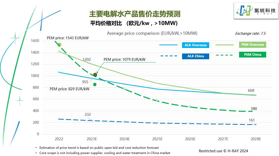經(jīng)過5年的發(fā)展,國內(nèi)的PEM制氫企業(yè)加大了人才的培養(yǎng)、核心工藝的研發(fā)能力、專用設(shè)備的自動化和核心材料產(chǎn)業(yè)鏈上下游的協(xié)同發(fā)展。 2023年公開資料顯示,國內(nèi)的MW級PEM制氫系統(tǒng)價格在850萬-900萬之間。同期歐洲的MW級PEM制氫設(shè)備價格也在1050-1200€/kw。 兩者價格非常接近。隨著國內(nèi)更多企業(yè)的加入,國產(chǎn)PEM電解槽將會達到250Nm3/h 或者更高的500Nm3/h。 采用了增強膜技術(shù)后,PEM電解槽可以采用更高的電密,電解槽大型化和高電密這對組合拳將進一步降低PEM電解水設(shè)備的初期投資。
