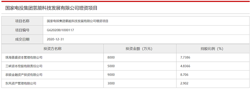 北京產權交易所的公示信息顯示,國家電投氫能公司增資項目于2020年12月31日成交,珠海普盛資本、三峽資本、農銀投資、東風資管分別向國家電投氫能公司投資8000、5000、9000、3000萬元,持股比例分別為7.7386%、4.8366%、8.706%、2.902%。