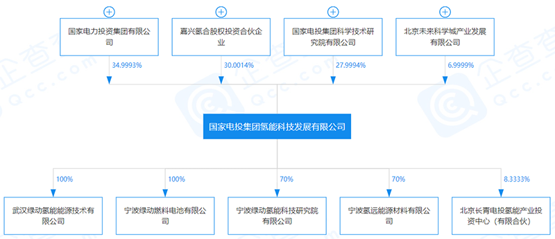 企查查顯示,國家電投氫能公司原始股權結構為國家電投集團(34.9993%)、嘉興氫合(30.0014%)、國電投集團科學技術研究院(27.9994%),未來科學城(6.9999%)。