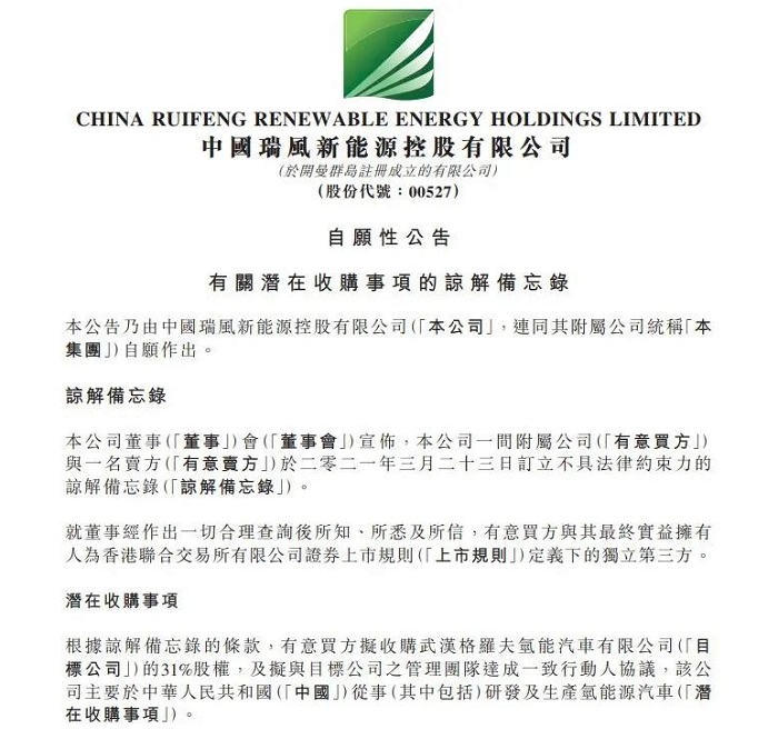 昨日晚間,瑞風(fēng)新能源(00527.HK)發(fā)布公告稱,公司一間附屬公司與一名賣方(“有意賣方”)于2021年3月23日訂立不具法律約束力的諒解備忘錄。