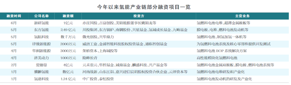 今年1-6月,氫燃料電池汽車產業鏈公開的大額融資事件達到10余起,其中愛德曼氫能、東方氫能、新研氫能融資額均在億元以上級別。