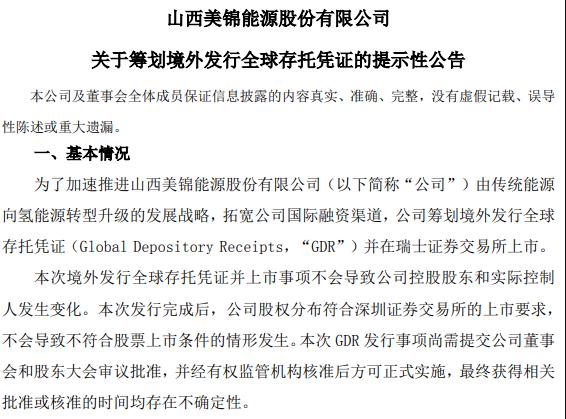 10月21日,美錦能源發(fā)布《關(guān)于籌劃境外發(fā)行全球存托憑證的提示性公告》,強(qiáng)調(diào)為加快山西美錦能源股份有限公司從傳統(tǒng)能源向氫能源轉(zhuǎn)型升級(jí)的發(fā)展戰(zhàn)略,拓寬公司國(guó)際融資渠道,公司籌劃境外發(fā)行全球存托憑證(Global Depository Receipts,“GDR”)并在瑞士證券交易所上市。本次境外發(fā)行全球存托憑證并上市事項(xiàng)不會(huì)改變公司控股股東和實(shí)際控制人。本次發(fā)行結(jié)束后,公司股權(quán)滿足深圳證券交易所上市要求,不會(huì)導(dǎo)致不符合股票上市條件的情形發(fā)生。本次GDR發(fā)行事項(xiàng)仍需提交公司董事會(huì)和股東大會(huì)審議批準(zhǔn),經(jīng)有權(quán)監(jiān)管機(jī)構(gòu)批準(zhǔn)后即可正式實(shí)施。最終獲得相關(guān)批準(zhǔn)或核準(zhǔn)的時(shí)間均存在不確定性。