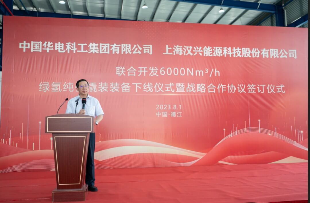 8月1日,中國華電科工集團有限公司(以下簡稱“華電科工”)與上海漢興能源科技股份有限公司(以下簡稱“漢興能源”)聯合開發的6000Nm3/h電解水綠氫純化撬裝裝備下線儀式暨戰略合作協議簽訂儀式,在漢興能源靖江制造基地舉行。