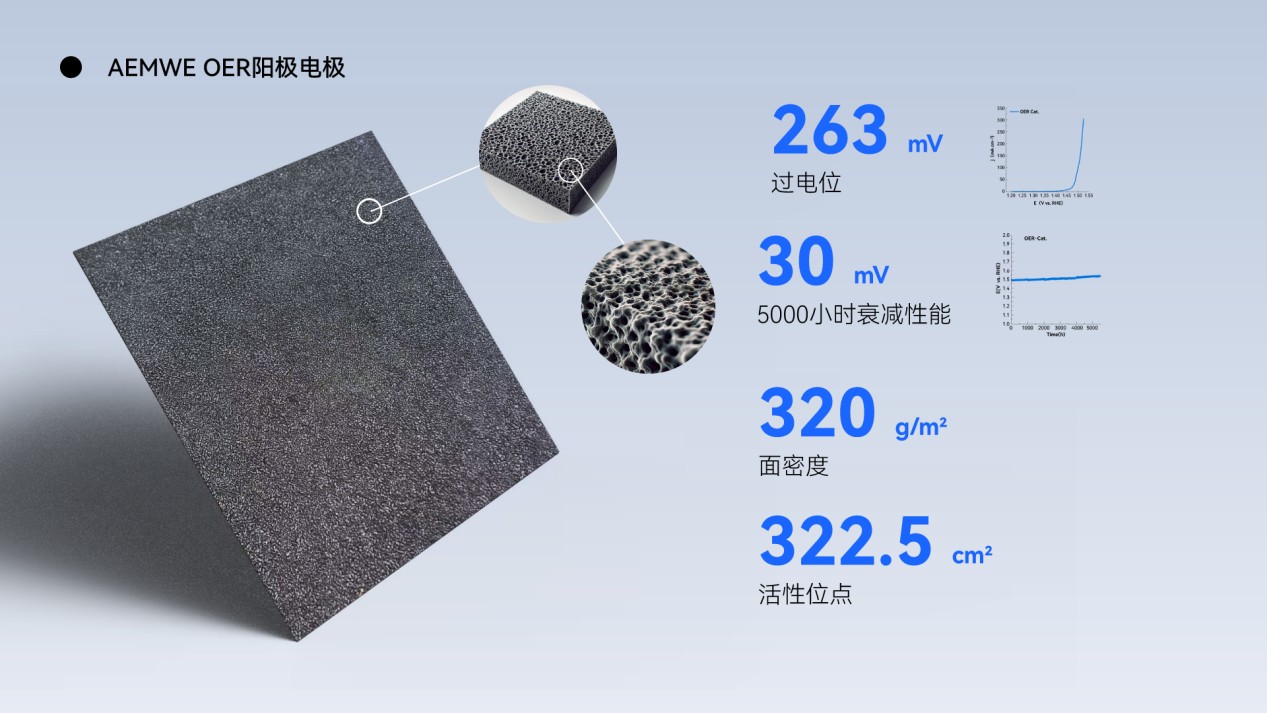 2. 陽(yáng)極電極:200 mA/cm2電流密度下263 mV過電位、5000小時(shí)30 mV的衰減