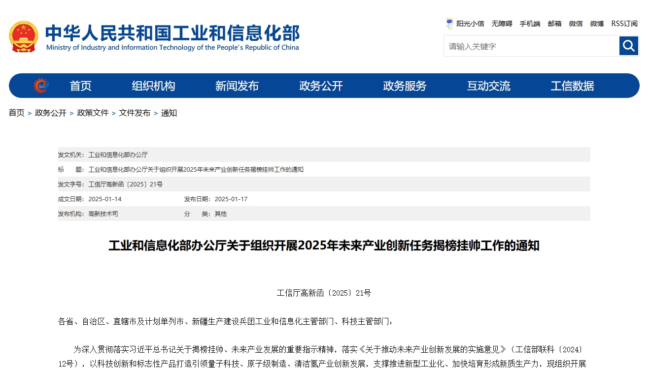 為深入貫徹落實習近平總書記關于揭榜掛帥、未來產業發展的重要指示精神,落實《關于推動未來產業創新發展的實施意見》(工信部聯科〔2024〕12號),以科技創新和標志性產品打造引領量子科技、原子級制造、清潔氫產業創新發展,支撐推進新型工業化、加快培育形成新質生產力,現組織開展2025年未來產業創新任務揭榜掛帥申報工作。有關事項通知如下: