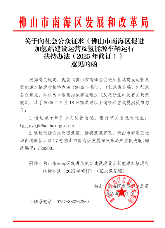 近日,佛山市南海區人民政府發布關于向社會公眾征求《佛山市南海區促進加氫站建設運營及氫能源車輛運行扶持辦法(2025年修訂)》意見的函。對于符合條件的加氫站和自用撬裝式加氫裝置,將分別按18元/kg、10元/kg給予運營企業加氫補貼,有效期至2025年12月31日。