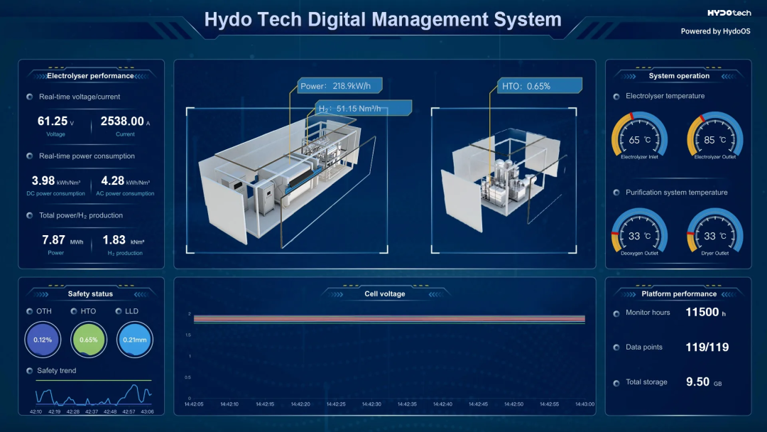 優(yōu)越性能之外,HydoLyser?更是數(shù)字原生的制氫系統(tǒng)。結(jié)合HydoLyser?插片式構(gòu)型與自研HydoOS?綠氫智能管理系統(tǒng),海德氫能為客戶打造覆蓋全生命周期內(nèi)的電解槽健康狀態(tài)監(jiān)測與運維服務(wù)能力,基于HydoOS? CVM技術(shù)可實時監(jiān)控單個小室的健康狀態(tài),對于已識別的故障單片可在項目現(xiàn)場12小時之內(nèi)完成快速的更換或升級,并嚴(yán)格遵循石化行業(yè)標(biāo)準(zhǔn)建立了完整的現(xiàn)場操作流程,運維成本降低至少90%以上,解決行業(yè)核心痛點。