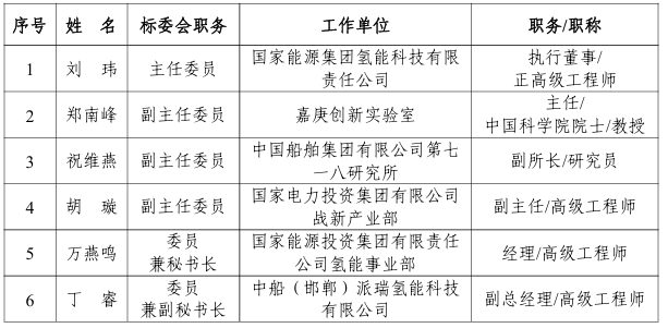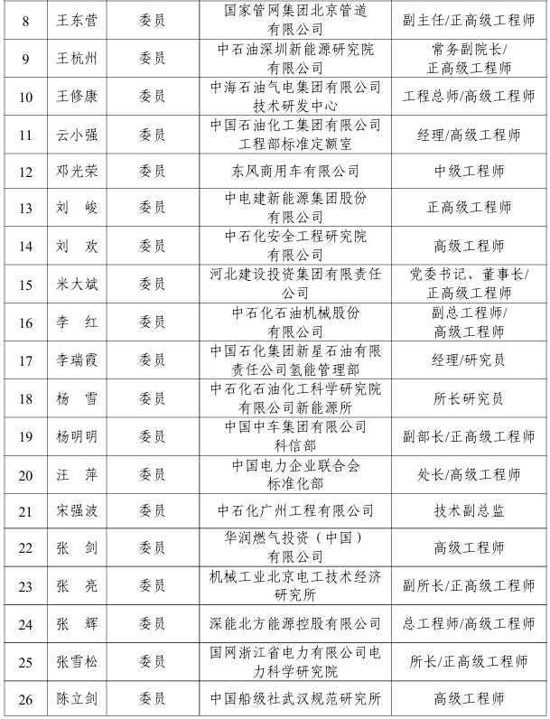 能源行業氫能制取標準化技術委員會編號為NEA/TC 49,負責能源行業氫能制取標準體系研究,具體承擔電解水制氫、可再生能源制氫、光解水制氫、化石能源制氫、其他制氫、天然氫和氫分離與提純等氫能制取方面的標準化工作,第一屆能源行業氫能制取標準化技術委員會由38名委員組成,委員名單如下: