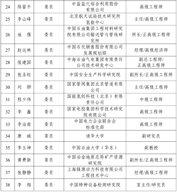 能源行業氫能儲存與運輸標準化技術委員會編號為NEA/TC 50,負責能源行業氫能儲存與運輸標準體系研究,具體承擔氫儲運技術管理、氫儲運裝備及關鍵附件、氫儲運工藝等氫能儲運方面的標準化工作,第一屆能源行業氫能儲存與運輸標準化技術委員會由38名委員組成,委員名單如下: