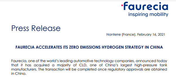 2月16日,佛吉亞(FAURECIA)宣布已收購中國最大高壓氣瓶公司斯林達(dá)(CLD)大部分股權(quán),交易將在獲得相關(guān)部門審批后完成。截止目前,雙方并未透露具體的收購金額。根據(jù)了解,此次收購為絕對控股,雙方將為中國市場開發(fā)生產(chǎn)III型和IV型儲氫罐。