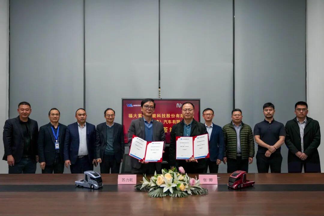 2023 年12月18日,威馳騰(福建)汽車有限公司(簡稱“威馳騰”)與福大紫金氫能科技股份有限公司(簡稱“福大紫金”)在福建漳州共同簽署一項具有里程碑意義的戰略合作協議。福大紫金總經理張卿,威馳騰創始人兼總裁蘇力乾攜公司領導、技術高管等出席見證了簽約儀式。