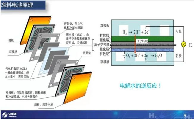 雖然目前政府對這個產業鏈的大力投入基本證明了可行性,但對個人來說,這種思考方式是對投資很有幫助的,搞清楚底層問題,才能更加堅定你的投資邏輯。首先看一下氫燃料電池的原理,燃料電池的概念最早1839年由英國的G.R.Grove提出,它不是跟天然氣汽車一樣靠燃燒帶動內燃機做功,而是依靠電解水的逆反應。工作過程是氫分子進入燃料電池的陽極,與覆蓋在陽極上的催化劑反應,釋放電子形成帶正電荷的氫原子,穿過電解液到達陰極,產生電流。陰極催化劑使氫原子與氧氣結合產生水。過程簡單而優雅,全程零碳排放。