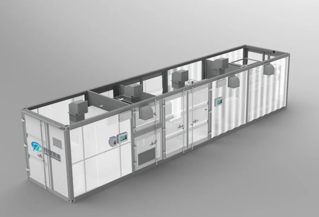 系統分為制氫倉、儲氫倉和燃電倉三個部分,在集裝箱尺寸不變的情況下,最大可有效擴容至制氫20Nm3/h,燃料電池100kW,儲氫20kg(@20MPa)