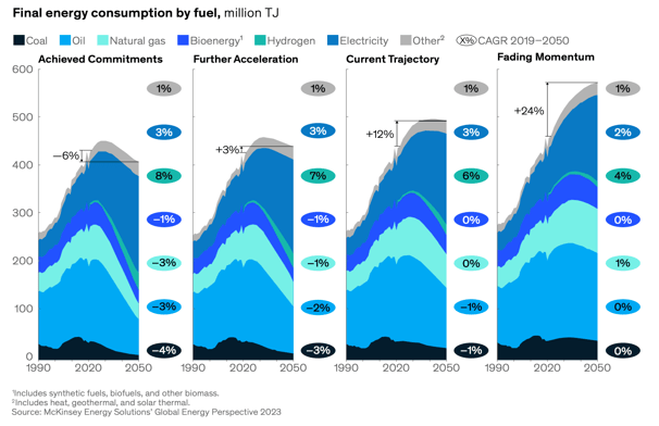 盡管挑戰(zhàn)重重,報告仍預(yù)測,在各種能源轉(zhuǎn)型方案的推動下,預(yù)計到2025年,電力和氫氣在最終能源消耗中的比例將達(dá)到27%-27%,到2050年將達(dá)到35%-60%。盡管化石燃料需求預(yù)計在2030年達(dá)到峰值,但在大多數(shù)情況下,到2040年的天然氣總需求預(yù)計會增加。