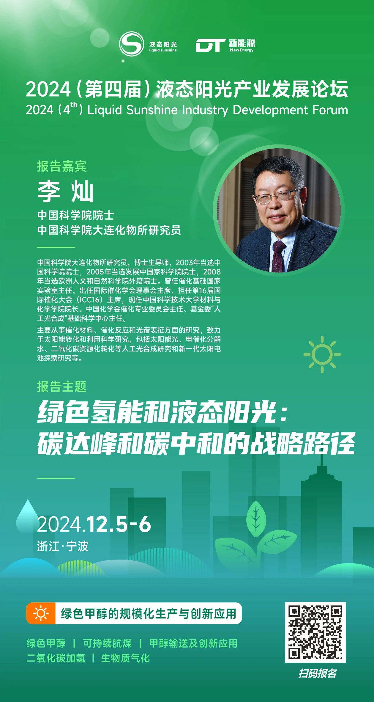 液態陽光、DT新能源特邀請中國科學院院士、中國科學院大連化物所研究員 李燦出席2024(第四屆)液態陽光產業發展論壇,并作主題報告《綠色氫能和液態陽光:碳達峰和碳中和的戰略路徑》。