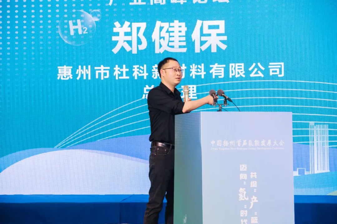 惠州市杜科新材料有限公司總經理鄭健保分享了《爭做氫能材料國產化排頭兵——杜科新材料企業推介》主題演講,作為國內外唯一一家可為客戶同時提供氫能源燃料電池雙極板用膠、膜電極用膠、增濕器用膠等解決方案的公司,以燃料電池用膠產品升級迭代為基礎,開發電解水制氫、全釩液流電池、膜電極、增濕器等用膠系列產品;研發生產具備自主知識產權的石墨模壓板系列產品。