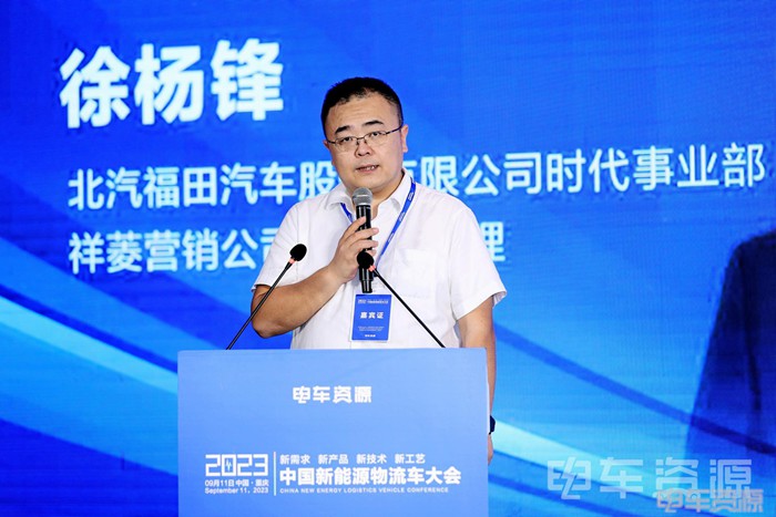 北汽福田汽車股份有限公司時代事業部祥菱營銷公司副總經理徐楊鋒結合行業新發展趨勢,做了《新賽道、新模式、新勢能》主題演講。他從市場分析、場景研究和抓住機會三部分進行闡述。