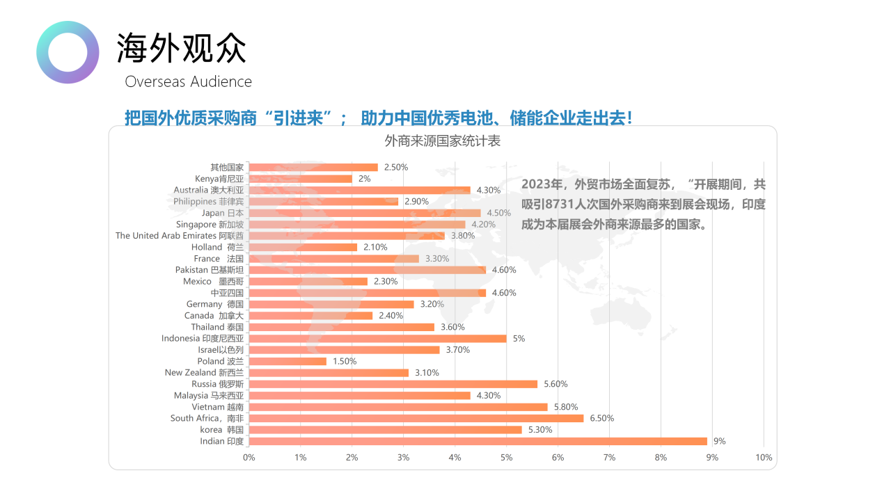 2023年,外貿市場全面復蘇,“開展期間,共吸引8731人次國外采購商來到展會現場,印度成為本屆展會外商來源最多的國家。
