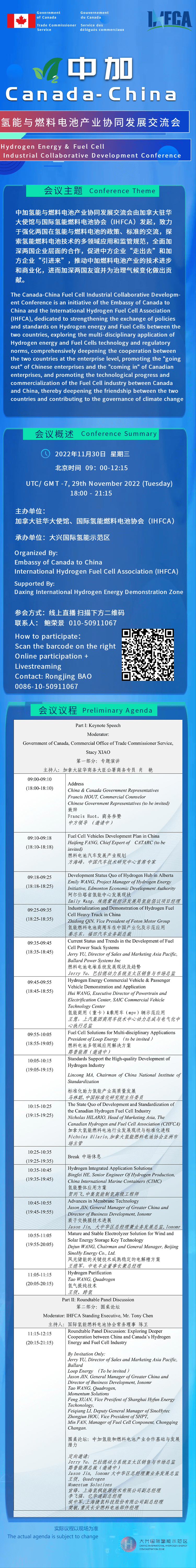 中加氫能與燃料電池產業協同發展交流會由加拿大駐華大使館與國際氫能燃料電池協會發起,由大興國際氫能示范區承辦。會議將于北京時間2022年11月30日上午召開,致力于強化兩國在氫能與燃料電池的政策、標準的交流,探索氫能燃料電池技術的多領域應用和監管規范,全面加深兩國企業層面的合作,促進中方企業“走出去”和加方企業“引進來”,推動中加燃料電池產業的技術進步和商業化,進而加深兩國友誼并為治理氣候變化做出貢獻。