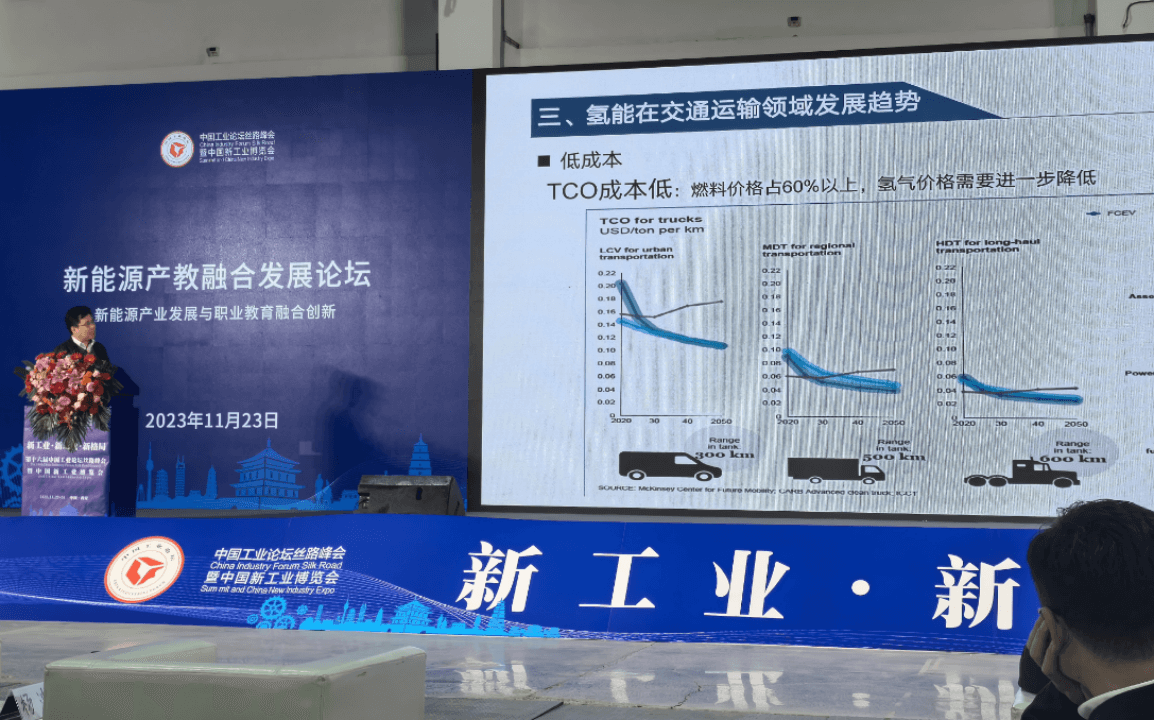 佛山大學(xué)特聘研究員周飛琨圍繞《氫能源及其在交通運(yùn)輸領(lǐng)域的發(fā)展趨勢(shì)》進(jìn)行了主題演講,介紹了氫能產(chǎn)業(yè)化的基礎(chǔ)和背景,氫能及制備儲(chǔ)運(yùn)、氫氣發(fā)電、氫動(dòng)力在交通運(yùn)輸領(lǐng)域的應(yīng)用,氫能及燃料電池汽車(chē)生態(tài)鏈條的構(gòu)成。指出在雙碳目標(biāo)下,交通運(yùn)輸領(lǐng)域中最迫切的需求是商用車(chē),尤其是中重型卡車(chē)的碳減排。氫能在交通領(lǐng)域高功率、高動(dòng)力性要求、高效率、長(zhǎng)續(xù)航、長(zhǎng)壽命、低成本、加注時(shí)間的便利性要求是發(fā)展趨勢(shì),并提出氫能在交通運(yùn)輸業(yè)“整車(chē)-動(dòng)力系統(tǒng)-燃料電池”聯(lián)動(dòng)設(shè)計(jì)的發(fā)展建議。氫交通運(yùn)輸產(chǎn)展建
