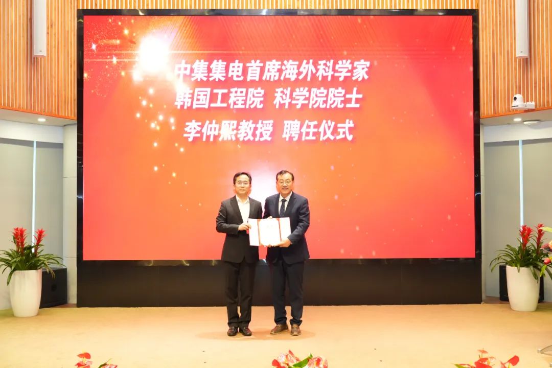 中集集電董事長王建中向韓國雙院士李仲熙教授授予聘書
