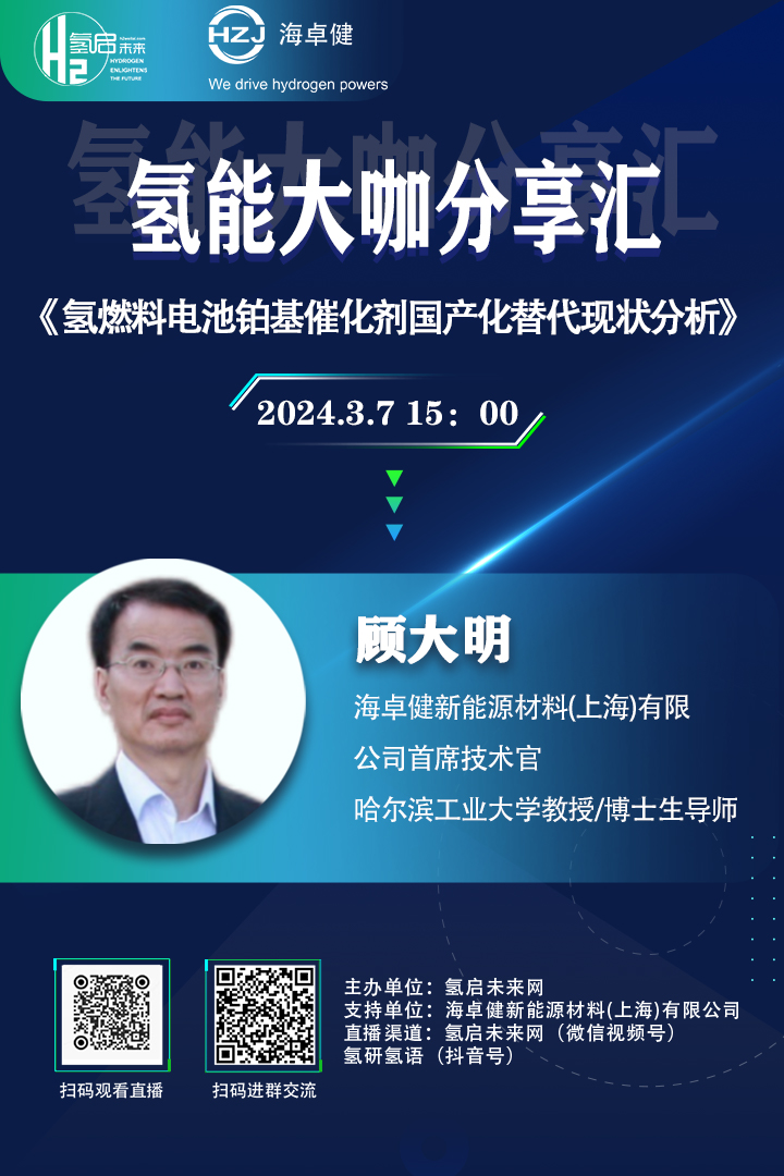 本次氫能大咖分享匯將邀請海卓健新能源材料(上海)有限公司首席技術官、哈爾濱工業大學教授/博士生導師顧大明,進行《氫燃料電池鉑基催化劑國產化替代現狀分析》主題分享。