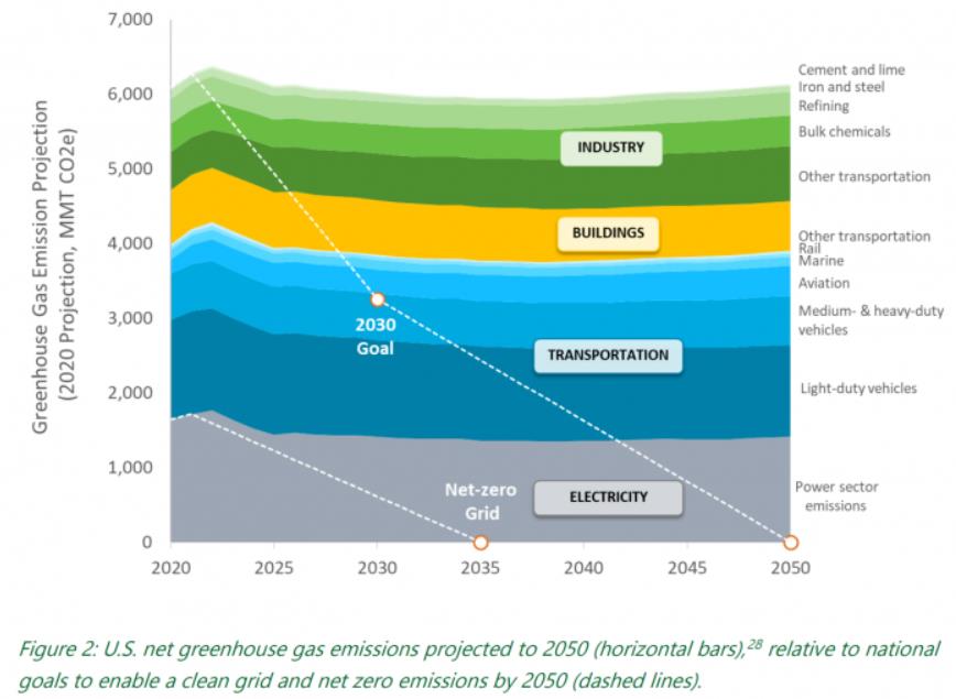 圖 2 - 預計到 2050 年的美國溫室氣體凈排放量 / 清潔電網和凈零排放目標