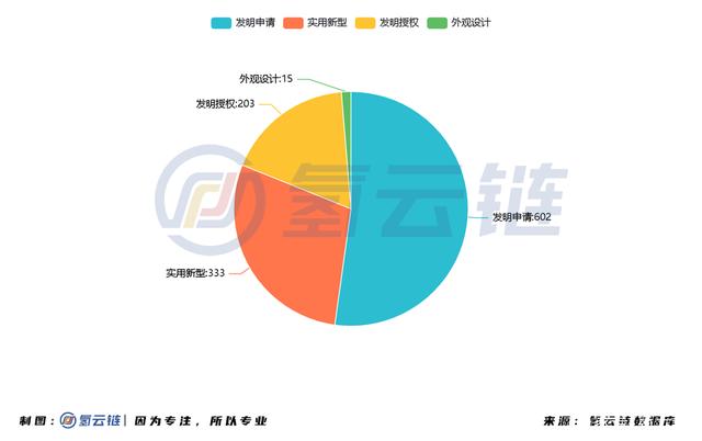 如下圖所示,從氫云鏈數據庫了解到,截止2021年2月24日,中國氫能源與燃料電池領域專利申請數達到1153件,其中發明申請為602件,占比52.21%;實用新型為333件,發明授權203件,外觀設計15件。