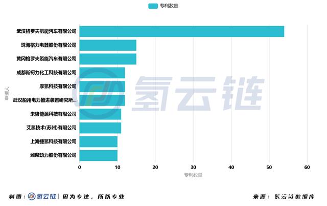 從氫能與燃料電池企業方面來看,格羅夫(武漢格羅夫、黃岡格羅夫)共有71件,排名第一;珠海格力電器以15件排名第二;成都新柯力化工以12件排名第三;摩氫科技、武漢船用電力裝置研究所、未勢能源、艾氫技術、捷氫科技、濰柴動力排名依次遞減。