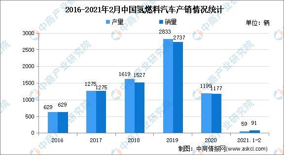我國氫燃料汽車產銷量整體呈增長趨勢,2016-2020年,我國燃料電池汽車的銷量分別為629輛、1275輛、1527輛、2737輛、1437輛,累計超7100輛。其中,2020年我國燃料電池汽車產銷均完成1000輛,同比分別下降57.5%和56.8%。