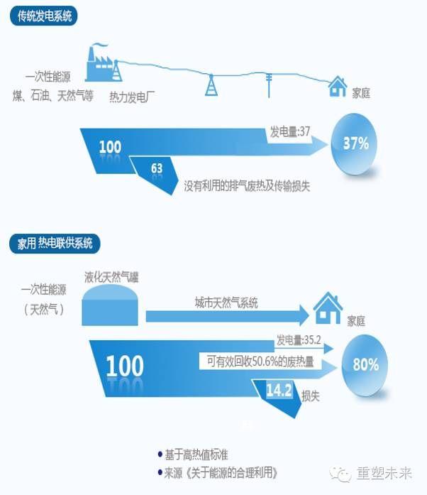 假設(shè)同樣以天然氣作為一次能源,通過傳統(tǒng)的熱電廠集中式和燃料電池分布式發(fā)電與供熱的綜合效率差距非常大。即使現(xiàn)代的發(fā)電廠的發(fā)電效率已經(jīng)可以超過60%,且通過熱電聯(lián)產(chǎn)的綜合熱效率也能超過85%,但是熱力的遠(yuǎn)距離運(yùn)輸導(dǎo)致用戶端的一次能源熱效率將低于70%。