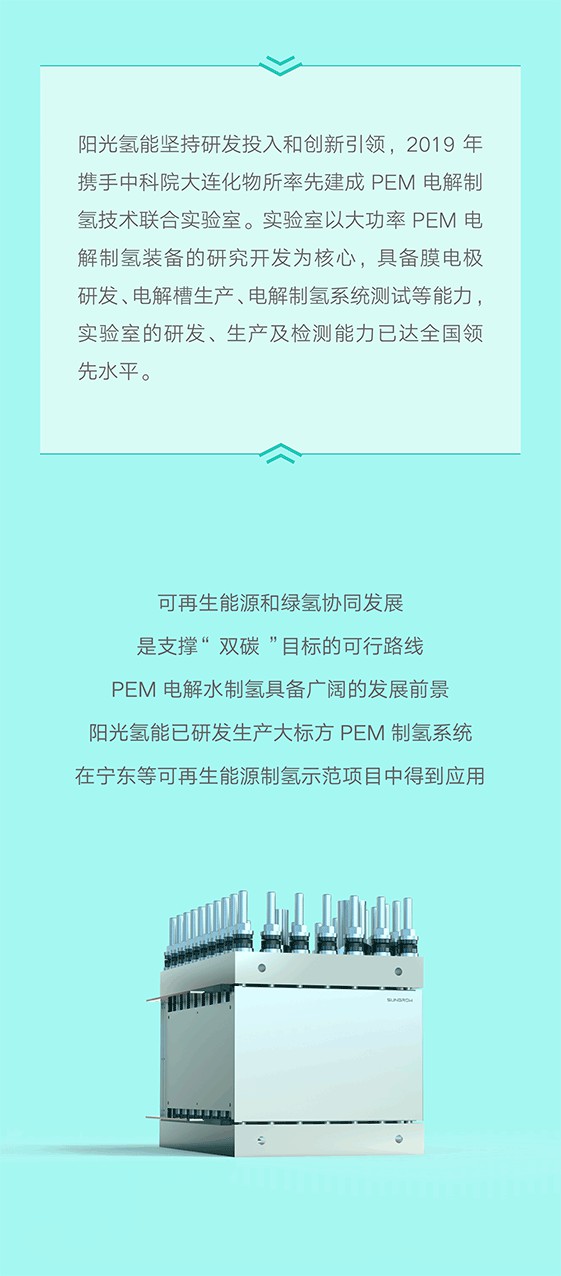 可再生能源和綠氫協同發(fā)展是支撐“雙碳”目標的可行路線,PEM電解水制氫具備廣闊的發(fā)展前景,陽光氫能已研發(fā)生產大標方PEM制氫系統(tǒng),在寧東等可再生能源制氫示范項目中得到應用。