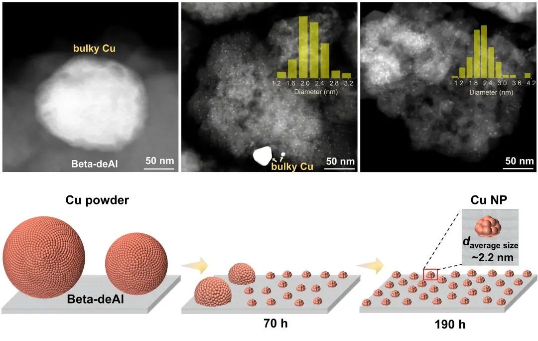 圖:甲醇氣氛誘導的大塊銅表面原子向沸石分子篩表面遷移、分散的過程。