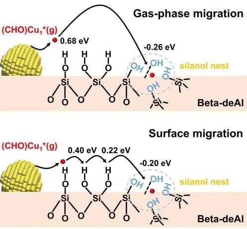 這些“坑”不是物理意義上的坑,而是化學意義上的“坑”,前期“掉”坑里的銅原子級中間體和沸石分子篩的羥基窩發生化學反應并和載體間形成強相互作用,使得整個過程的熱力學變得有利;后期大顆粒上的銅原子會繼續向這些新的成核位點遷移,并最終達到動態的平衡。這在原有催化體系中新引入了作用力,扭轉了催化劑顆粒動態演化的過程?!拔覀儾粌H切斷了顆粒變大的路徑,還順勢創造了新的成核位點,最終逆轉了該過程。”王亮說。