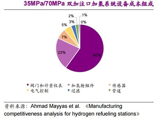 (1)最重要的設(shè)備成本是閥門和計量儀表,占設(shè)備成本的60%左右。用于監(jiān)測壓力和氫氣泄漏的傳感器也是加氫系統(tǒng)成本的重要組成部分;
