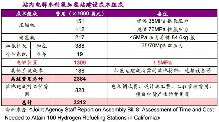美國加州加氫站采用現(xiàn)場電解水生產(chǎn)氫氣。該加氫站日供氫能力130kg/d,加氫壓力35MPa、70MPa兩種。加氫站的建設(shè)成本分析如下。