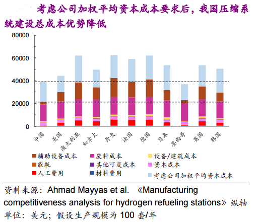 (3)我國加氫站壓縮系統(tǒng)建設(shè)成本低的優(yōu)勢在于勞動力成本和設(shè)備/建設(shè)成本低。