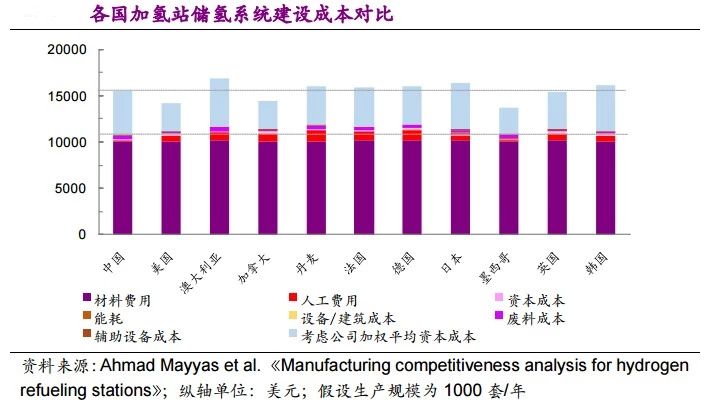 (3)我國加氫站儲氫系統(tǒng)的建設(shè)成本優(yōu)勢仍來自于中國低廉的勞動力成本。