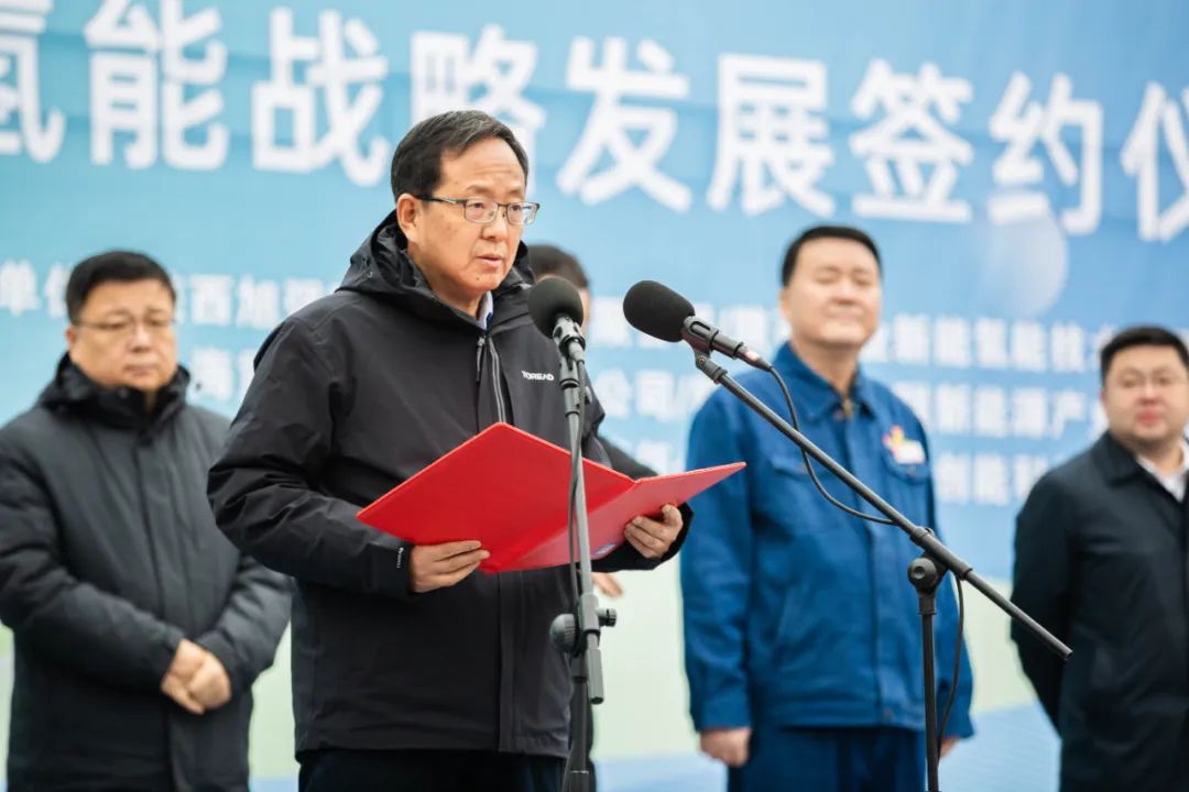 作為本次活動的指導單位,陜西省能源局副局長劉齊及陜西省工業和信息化廳原材料工業處副處長謝韜對本次活動的舉辦予以充分的肯定,并做要求。劉齊副局長表示,此次龍門鋼鐵33輛氫能重卡的交付使用,既是實現我省能源戰略轉型的有力實踐,也是深入推進大氣污染治理、加快構建綠色低碳運輸體系的重要舉措,更是拓展氫能應用空間、助推氫能產業鏈高質量發展的具體行動。為我省環保績效創A企業建立綠色低碳的氫能運輸體系提供了標桿。勉勵企業之間開展更深層次的交流合作,持續擴大氫燃料電池汽車的示范應用規模,加快建設“西安-渭南-韓城”氫能廊道。